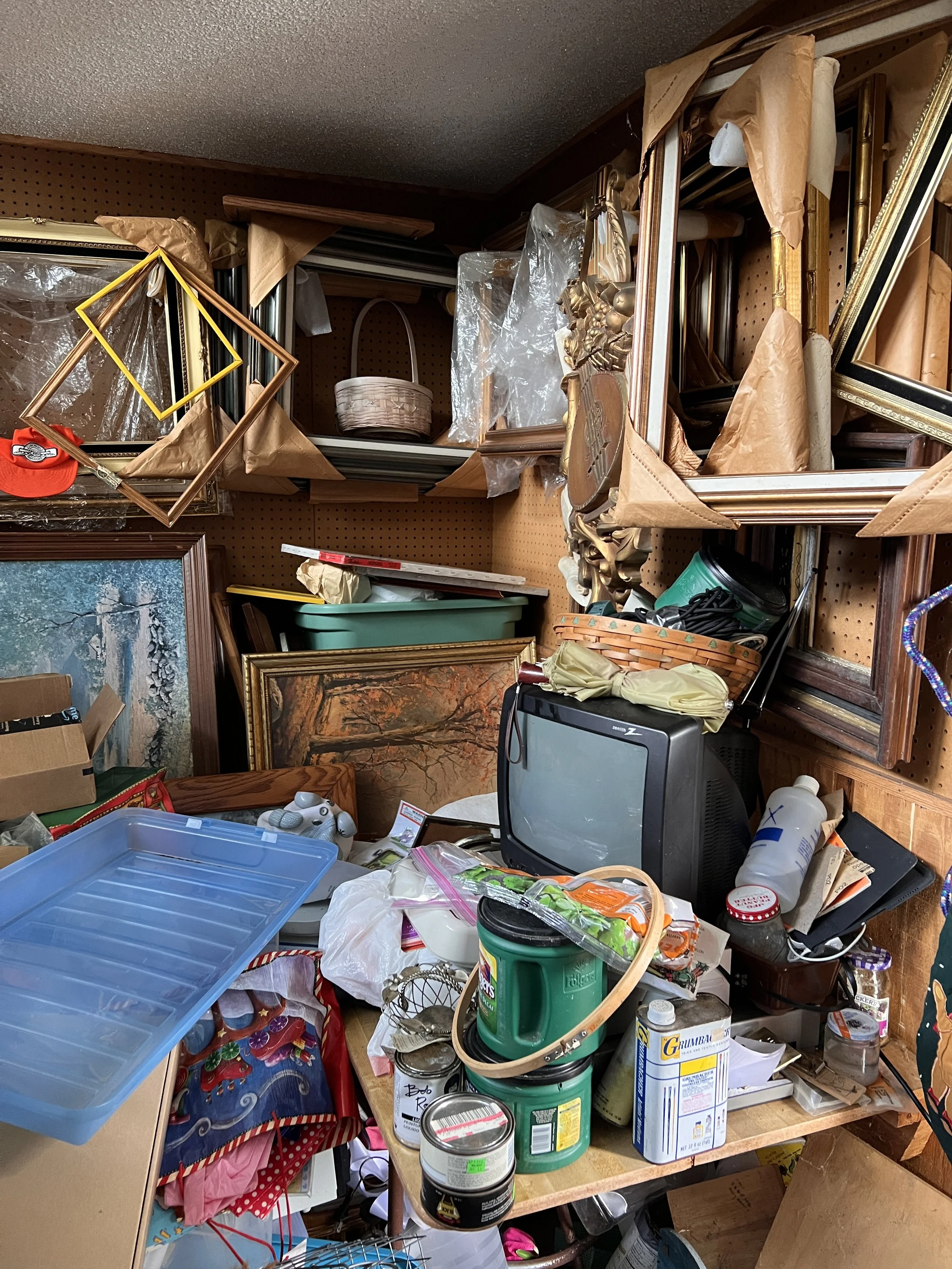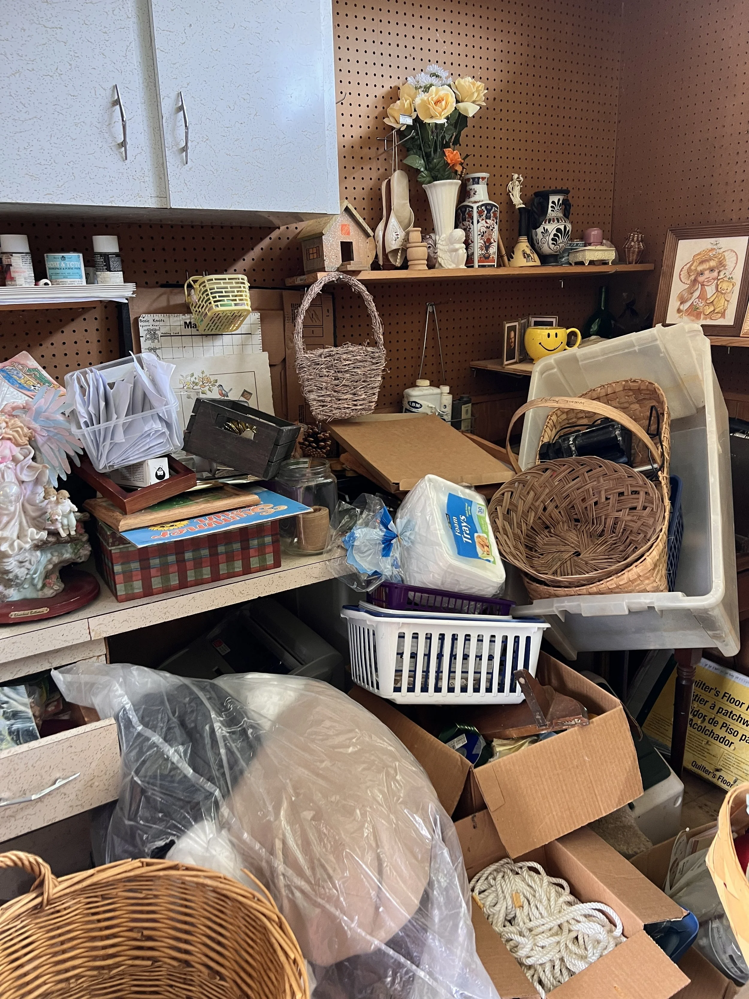 For purposes of the craft studio, back stock basket weaving supplies and painting frames will live up there between projects because she has a lot of these supplies. When Granny goes for a hobby, she’s all in! So I expect the shop purge will include discoveries of more crafting treasures!